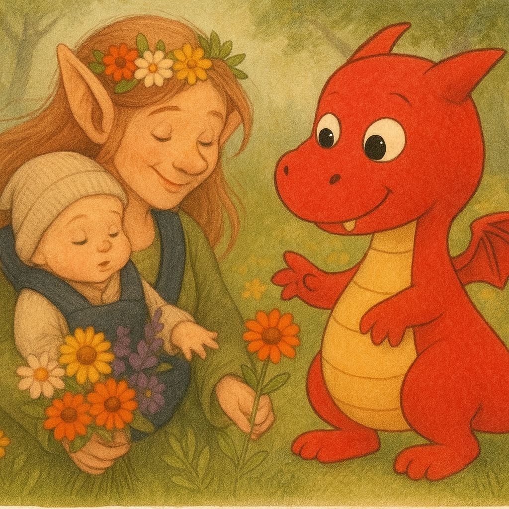 Och så blev den stora, röda draken en del av deras lek. Han hjälpte till att bära blommor med sin svans, blåste en liten varm vind som torkade daggen från marken, och Flora skrattade så mycket att hon nästan tappade sin squash.