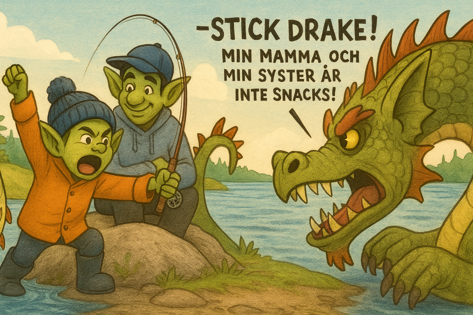 Det var August som kom springande, fortfarande lycklig över sin nyfångade abborre men nu redo att försvara sin familj. Han höjde sina små trollarmar och ropade: